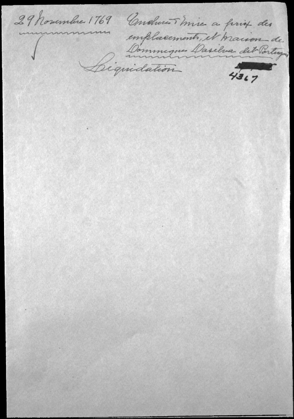 - Enchère et mise à prix des emplacements et d'une maison situés en la Haute-Ville de Québec, rue des Remparts, appartenant aux mineurs de feu Dominique Dasilva (Dassylva) dit Portugais, maître maçon de la ville de Québec, veuf de feue Élisabeth-Geneviève Millet (Milet), et d'Élisabeth Jahan (Jean)