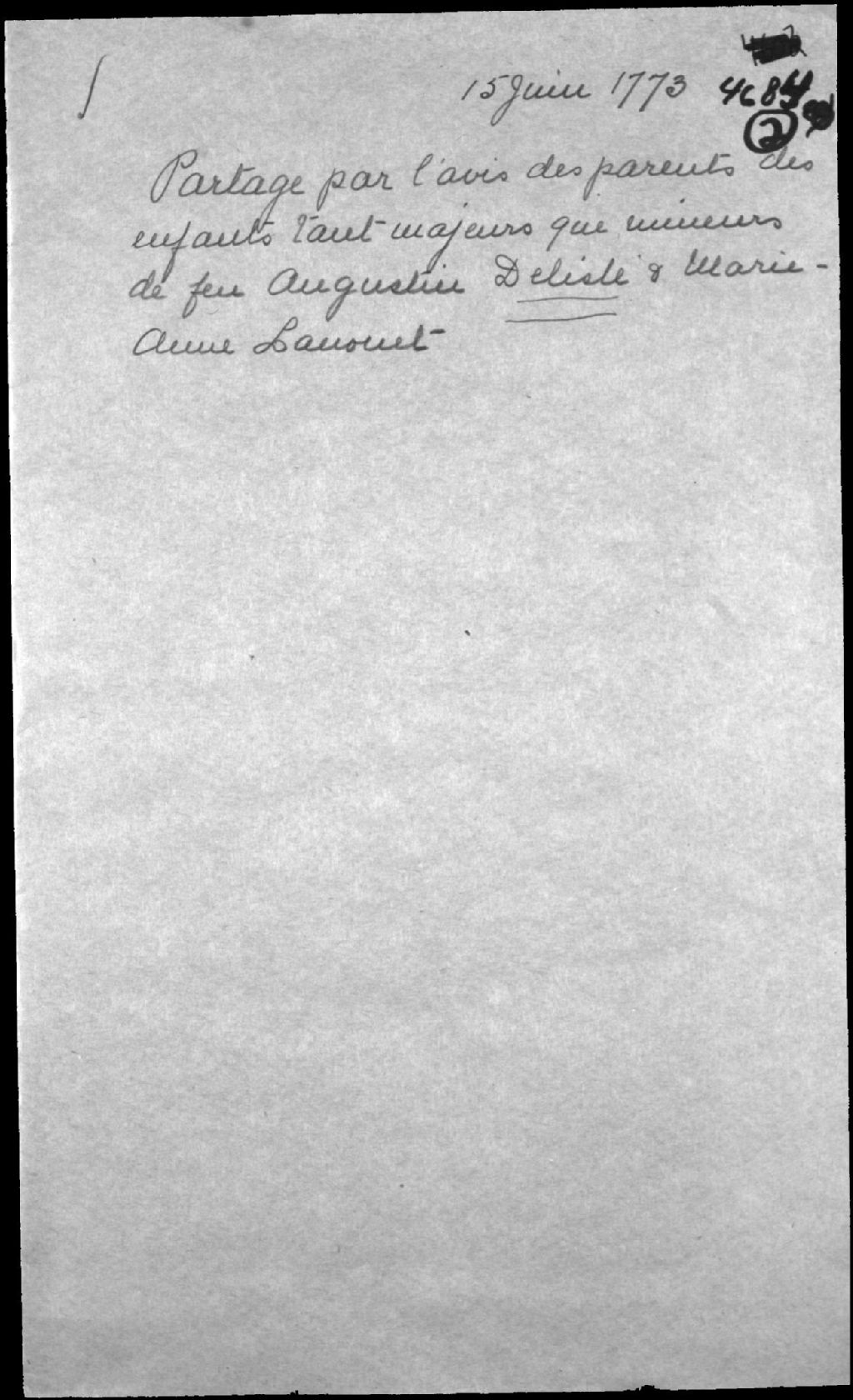 Tutelle aux mineurs et acte d'assemblée pour la succession aux héritiers de feu Augustin Delisle, habitant de la seigneurie de Neuville, paroisse de Pointe-aux-Trembles, et de feue Marie-Anne (Marianne) Lanouet (Lanouette), 31 mai 1773 au 15 juin 1773, Archives nationales à Québec, Fonds Cour supérieure. District judiciaire de Québec. Tutelles et curatelles, (03Q,CC301,S1,D4684B).