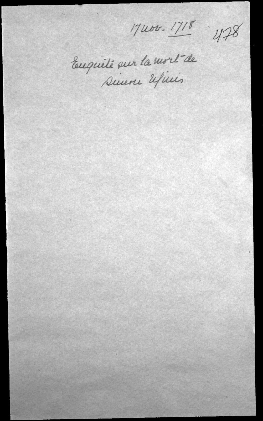 Visite du cadavre de feu Simon Minier (Meunier, Minis) dit Frappe d'abord, soldat des troupes de la Marine, trouvé la veille sur la terre de Louis Cottin dit Tugal (Dugal), habitant de la paroisse de Saint-Augustin, et rapport de Jordain Lajus, lieutenant des chirurgien, 17 novembre 1718, Archives nationales à Québec, Fonds Cour supérieure. District judiciaire de Québec. Tutelles et curatelles, (03Q,CC301,S1,D478).