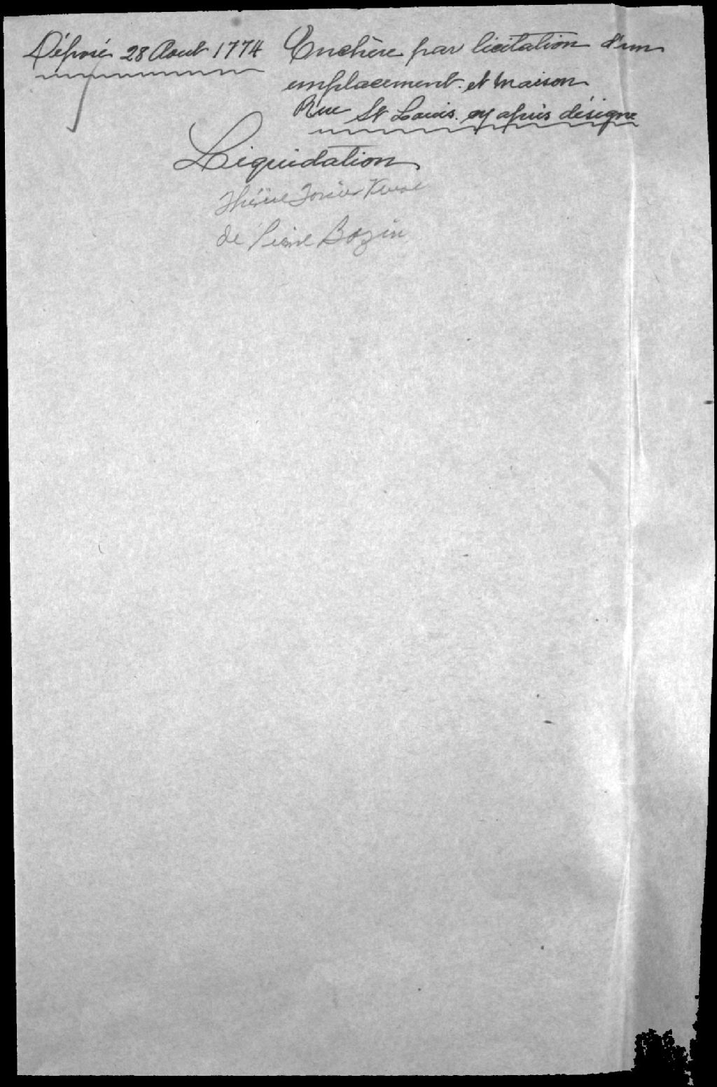 Enchère par licitation d'un emplacement et d'une maison situés en la Haute-Ville de Québec, rue Saint-Louis, appartenant aux héritiers de feu Pierre Bazin (Basin), négociant de la ville de Québec, et de Thérèse Fortier, 28 août 1774, Archives nationales à Québec, Fonds Cour supérieure. District judiciaire de Québec. Tutelles et curatelles, (03Q,CC301,S1,D4829).