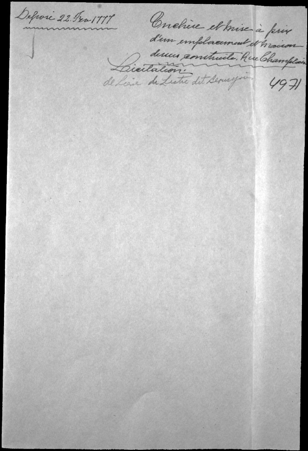 Enchère et mise à prix d'un emplacement et d'une maison situés en la ville de Québec, rue Champlain, appartenant à Pierre Delestre dit Beaujour, entrepreneur de maçonnerie de la ville de Québec, et à feue Marie-Anne (Marianne) Silvestre (Sylvestre), 21 février 1777, Archives nationales à Québec, Fonds Cour supérieure. District judiciaire de Québec. Tutelles et curatelles, (03Q,CC301,S1,D4971).