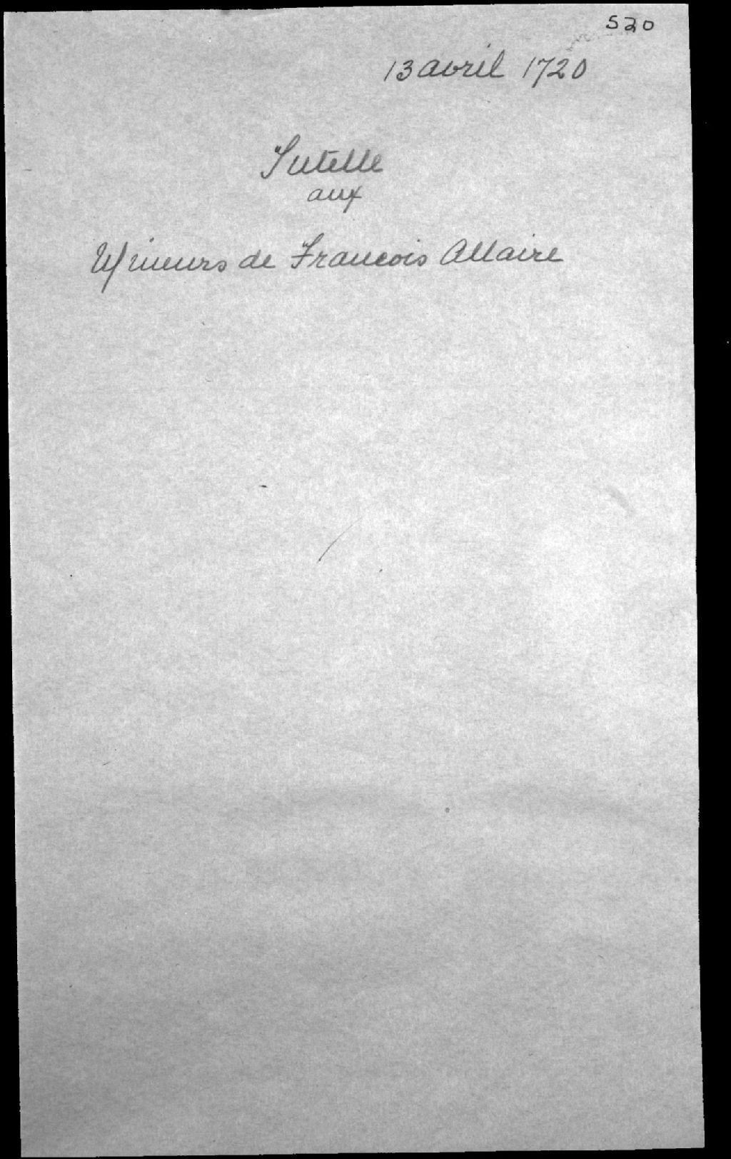 Tutelle aux mineurs de feu François Allaire, de Saint-Laurent, 13 avril 1720, Archives nationales à Québec, Fonds Cour supérieure. District judiciaire de Québec. Tutelles et curatelles, (03Q,CC301,S1,D520).