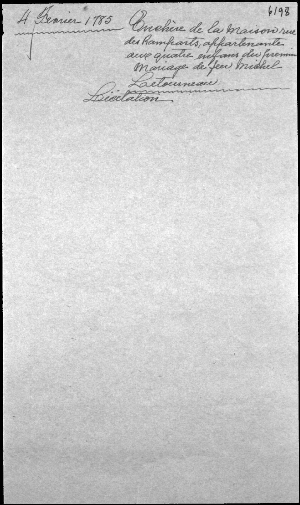 - Enchère et mise à prix d'un emplacement et d'une maison situés en la Haute-Ville de Québec, rue des Remparts, appartenant aux enfants héritiers de feu Michel Létourneau, maître menuisier de la ville de Québec, et de feue Catherine Routier (Routhier)