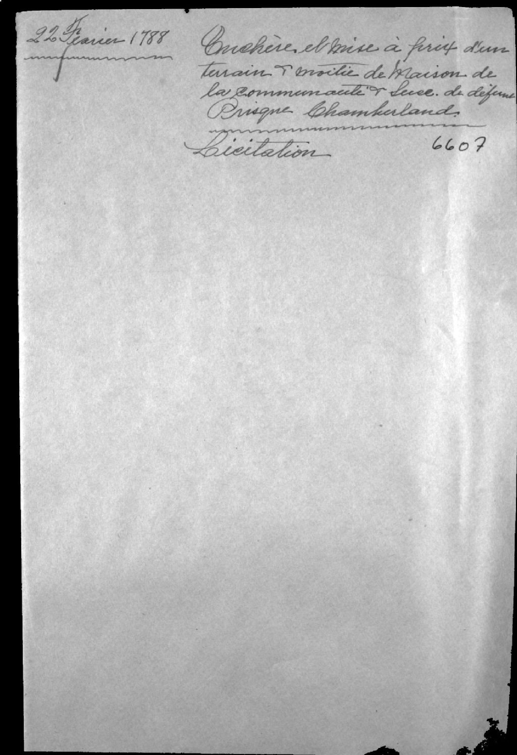 Enchère et mise à prix d'un terrain et de la moitié d'une maison situés en la ville de Québec, au cap aux Diamants, dépendants de la succession de feu Prisque Chamberlan (Chamberland), maître charpentier de la ville de Québec, et de Marie-Anne (Marianne) Vivier