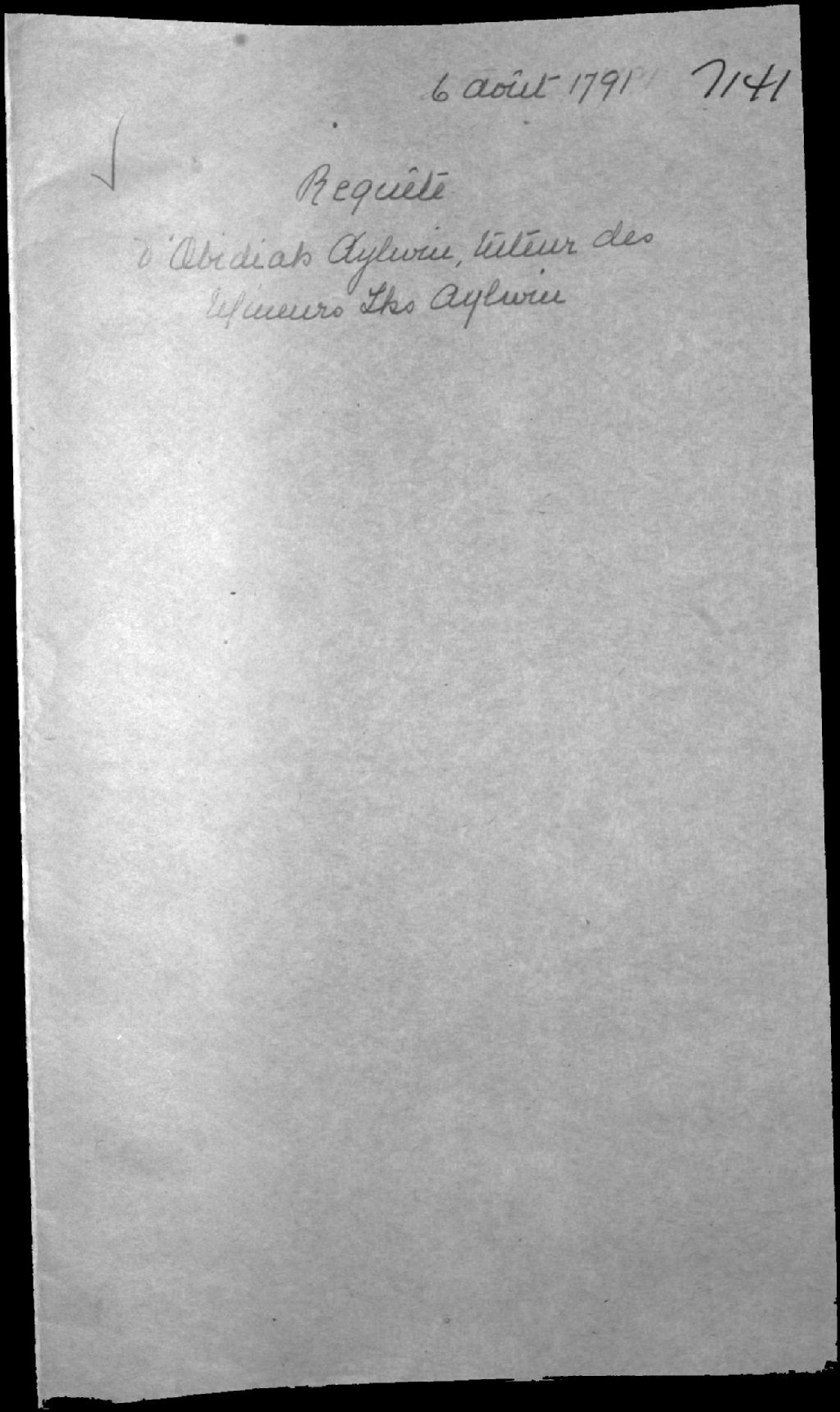 Renonciation par les héritiers mineurs à la succession de feu Thomas Aylwin et assemblée des parents et amis pour la tutelle des mineurs de feu Thomas Aylwin, écuyer, et de feue Lucy Aylwin, 6 août 1791 au 13 août 1791, Archives nationales à Québec, Fonds Cour supérieure. District judiciaire de Québec. Tutelles et curatelles, (03Q,CC301,S1,D7141).
