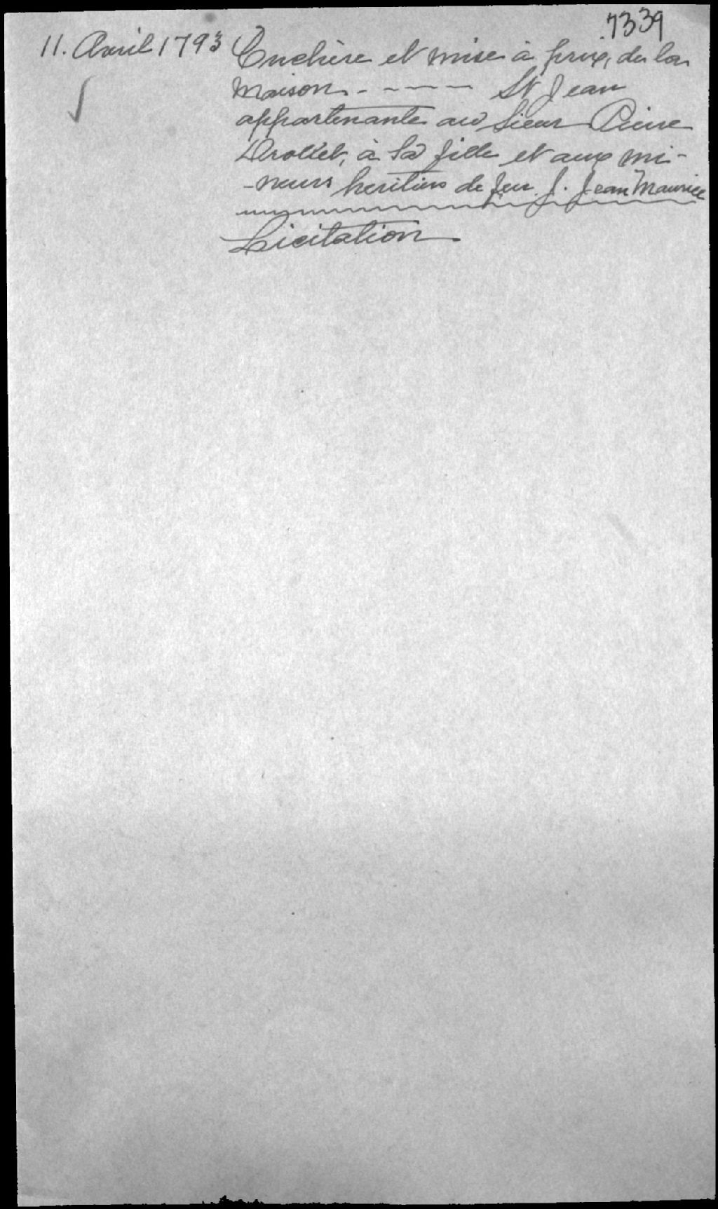 - Enchère et mise à prix par licitation d’une maison située sur la rue et carrefour Saint-Jean, appartenant au Sieur Pierre Drollet (Drolet), à sa fille et aux mineurs héritiers de feu Jacques-Jean Maurice et de feue Geneviève Brunet Dauphiné (Dauphinet, Dauphinais)