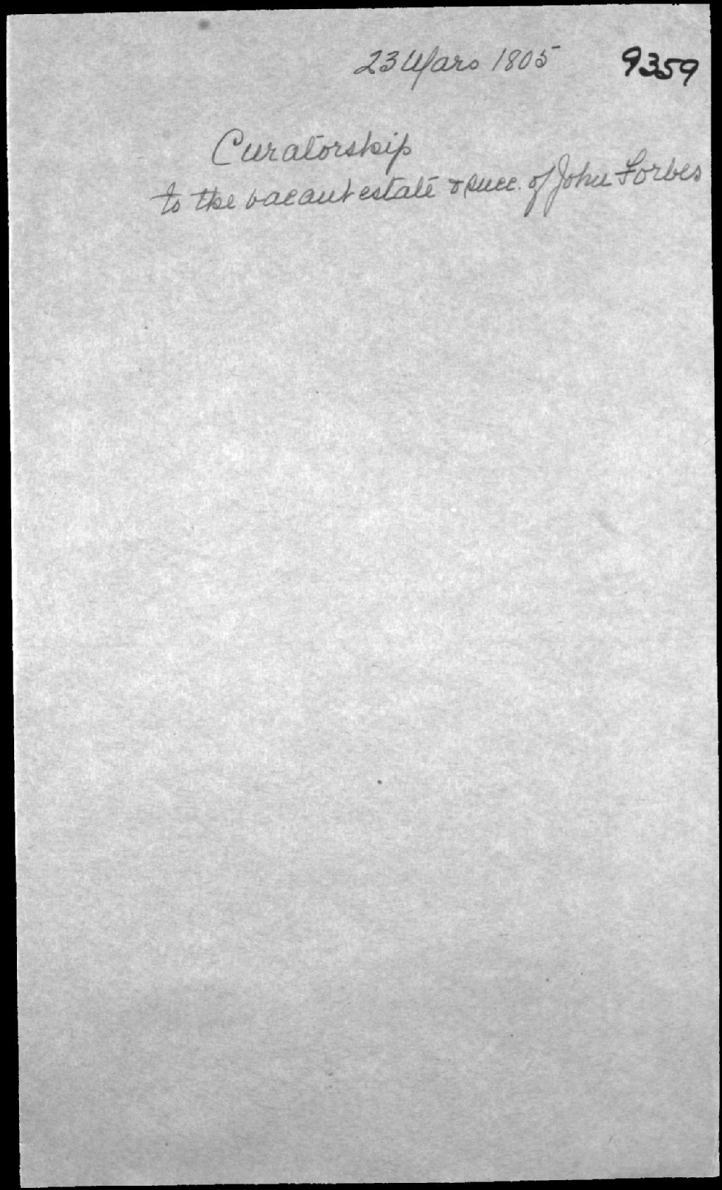 Curatelle pour la succession vacante de feu John Forbes, commerçant de Québec, 23 mars 1805, Archives nationales à Québec, Fonds Cour supérieure. District judiciaire de Québec. Tutelles et curatelles, (03Q,CC301,S1,D9359).