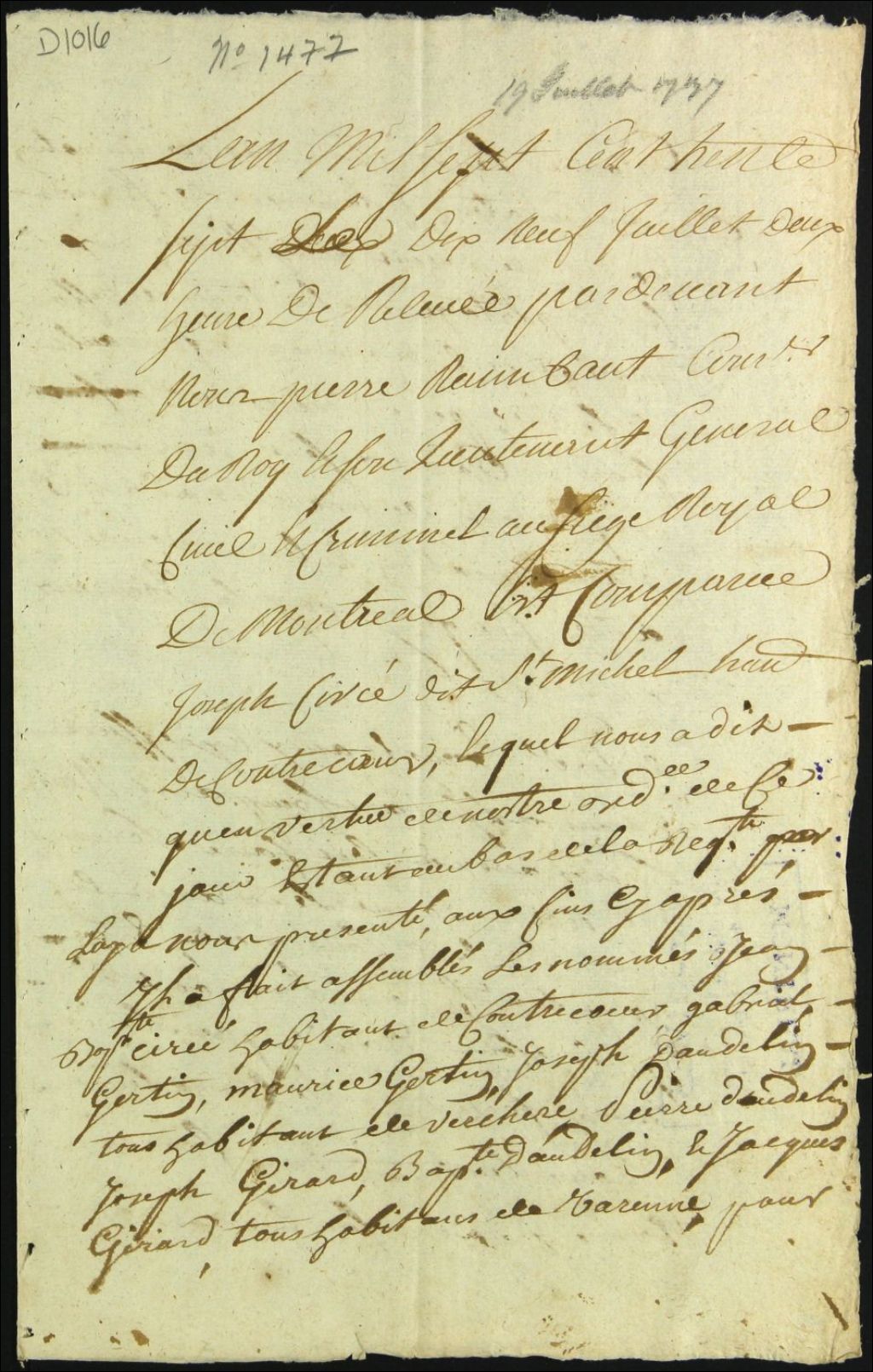 Curatelle de François Émery Coderre, absent du pays, aux fins du partage des héritages des défunts [Antoine] Émery Coderre et Marie Anne Favreau, 19 juillet 1737, Archives nationales à Montréal, Fonds Cour supérieure. District judiciaire de Montréal. Tutelles et curatelles, (06M,CC601,S1,SS1,D1016).