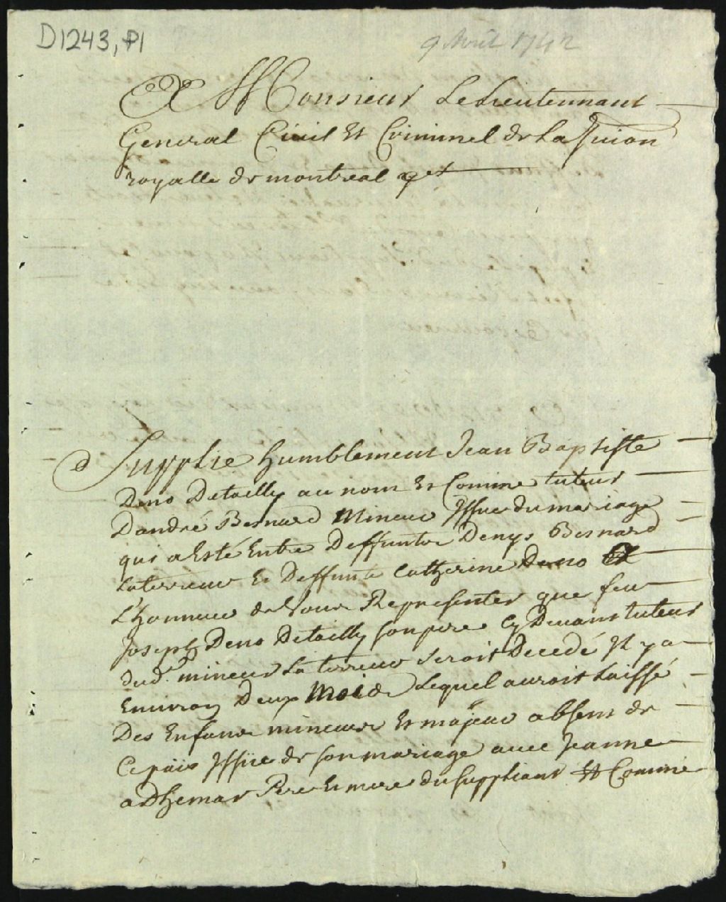 Tutelle d'André Bernard, enfant mineur des défunts Denis Bernard Laterreur [Benard] et Catherine Deneau Detailly]