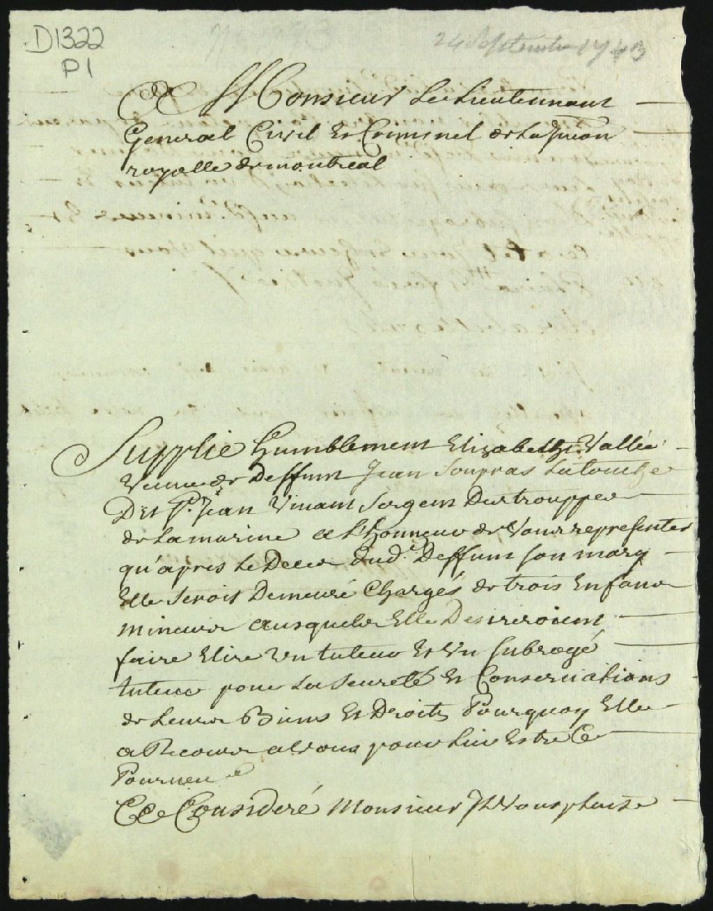 Tutelle des enfants mineurs de feu Jean Latouche Saint-Jean Soupras et d'Élisabeth Vallée [Sansoucy Valet], 24 septembre 1743, Archives nationales à Montréal, Fonds Cour supérieure. District judiciaire de Montréal. Tutelles et curatelles, (06M,CC601,S1,SS1,D1322).