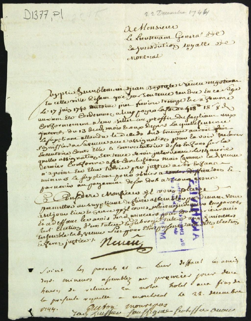 Tutelle des enfants mineurs de feu Antoine Piette Lafrenière [Trempe] et de Marie Boucher, 22 décembre 1744-5 janvier 1745, Archives nationales à Montréal, Fonds Cour supérieure. District judiciaire de Montréal. Tutelles et curatelles, (06M,CC601,S1,SS1,D1377).