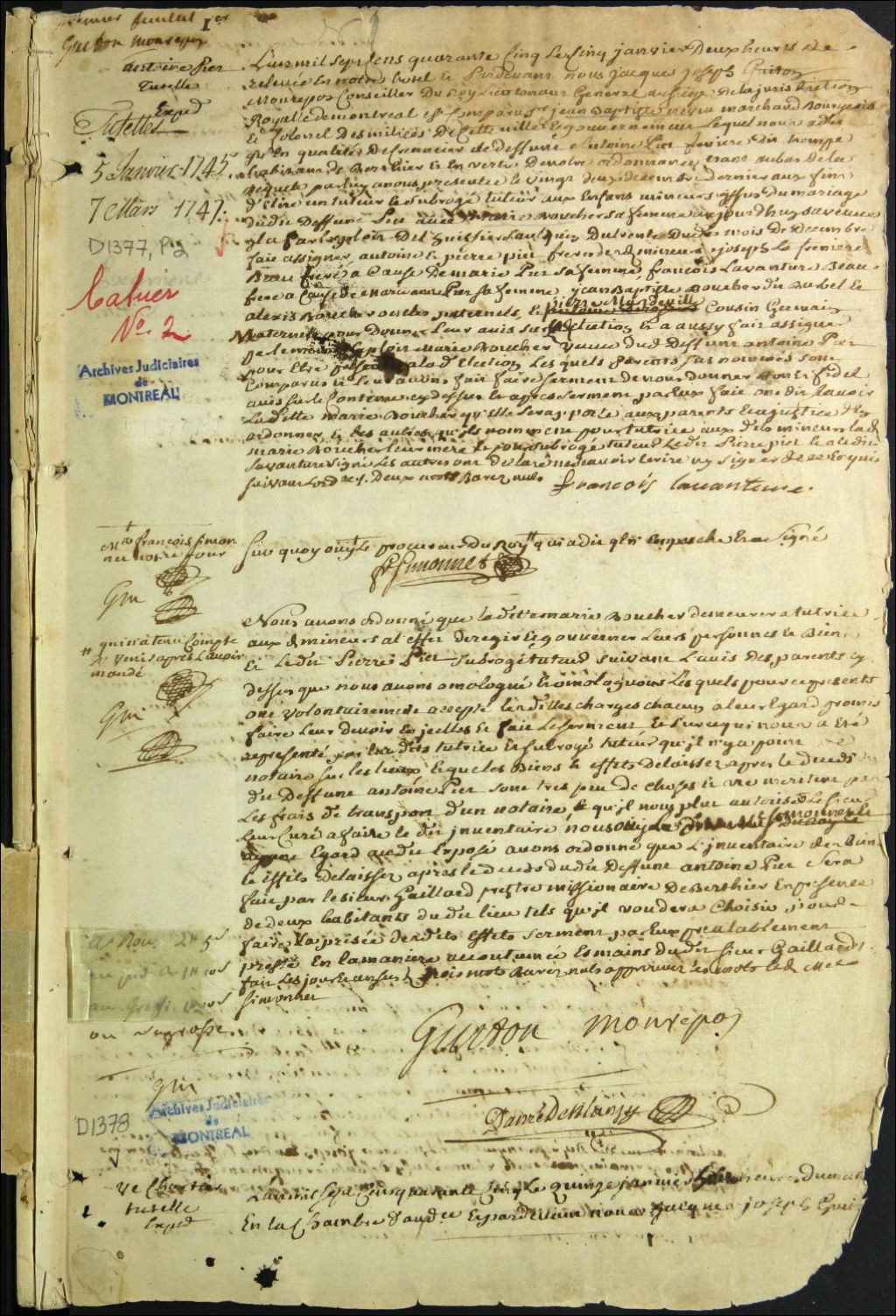 Tutelle des enfants mineurs de feu Robert Chartier et de Marie Anne Demers [Dumais], 15 janvier 1745, Archives nationales à Montréal, Fonds Cour supérieure. District judiciaire de Montréal. Tutelles et curatelles, (06M,CC601,S1,SS1,D1378).