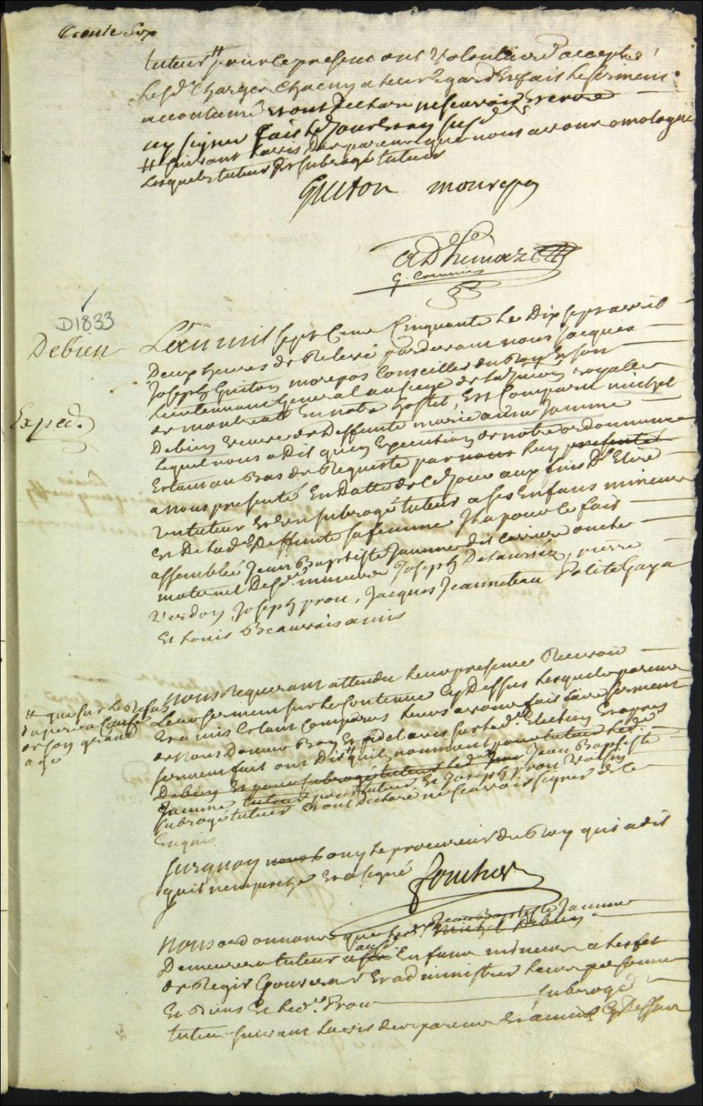 Tutelle des enfants mineurs de feu Marie Anne Jamme [Carrière] et de Michel Debien, 17 avril 1750, Archives nationales à Montréal, Fonds Cour supérieure. District judiciaire de Montréal. Tutelles et curatelles, (06M,CC601,S1,SS1,D1833).