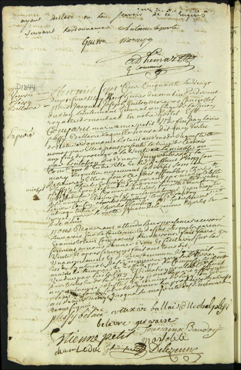 Tutelle des enfants mineurs de feu Jean Louis Plessis Bélair et de Marie Anne Petit [Boismorel] - Administration tutélaire, 22 mai 1750, Archives nationales à Montréal, Fonds Cour supérieure. District judiciaire de Montréal. Tutelles et curatelles, (06M,CC601,S1,SS1,D1844).