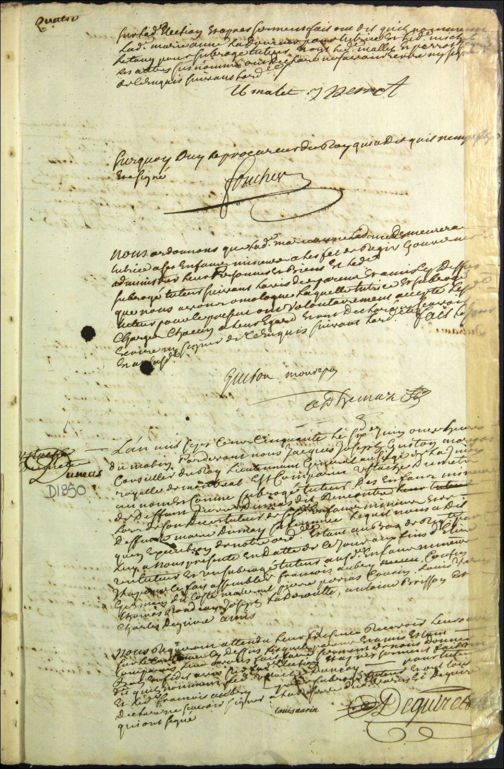 Tutelle des enfants mineurs des défunts Pierre Dumas Rencontre [Domas] et Marie [Demers] Dumais, 6 juin 1750, Archives nationales à Montréal, Fonds Cour supérieure. District judiciaire de Montréal. Tutelles et curatelles, (06M,CC601,S1,SS1,D1850).
