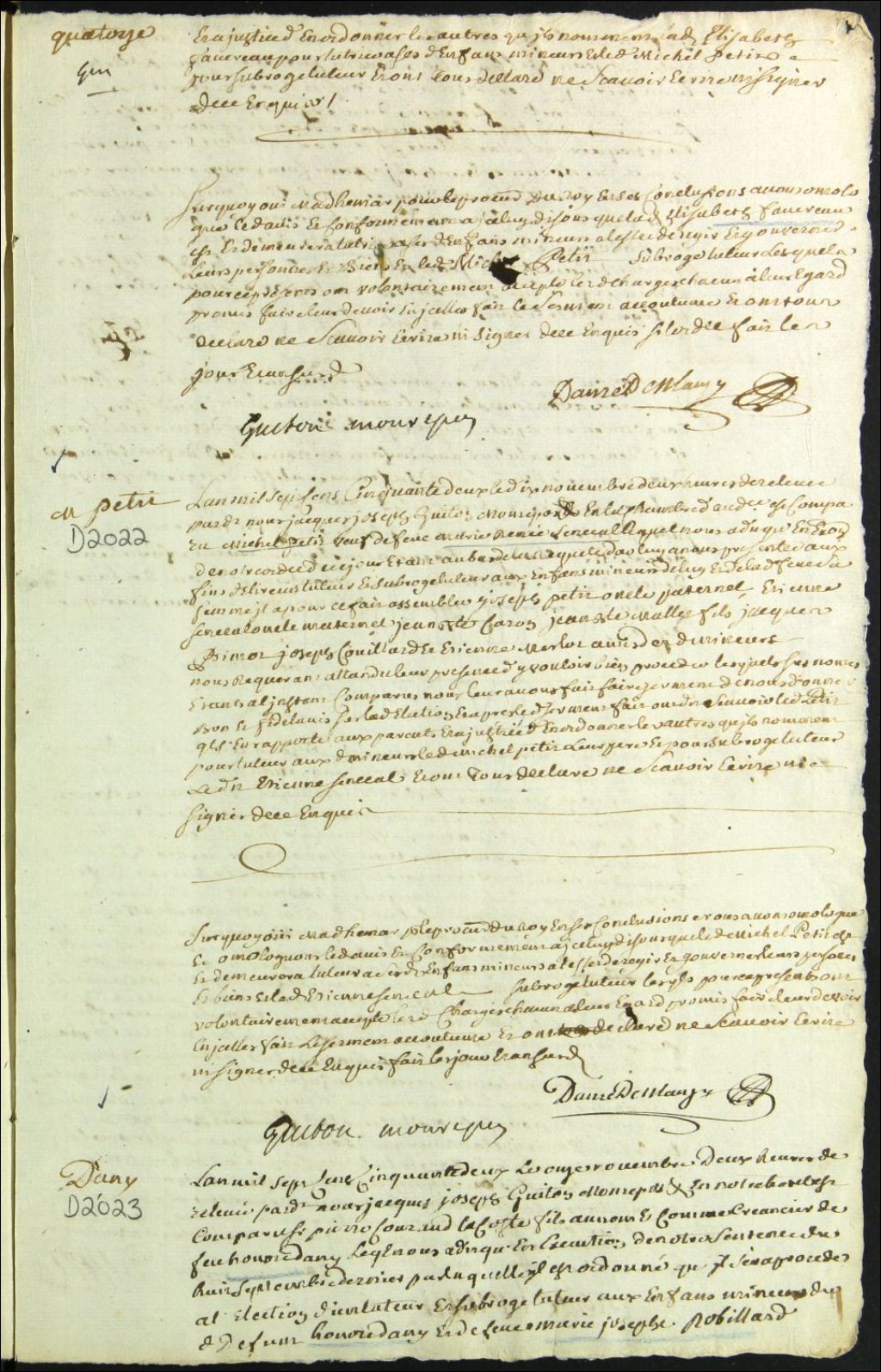 Tutelle des enfants mineurs des défunts Honoré Danis [Tourangeau] et Marie Josèphe Robillard, 11 novembre 1752, Archives nationales à Montréal, Fonds Cour supérieure. District judiciaire de Montréal. Tutelles et curatelles, (06M,CC601,S1,SS1,D2023).