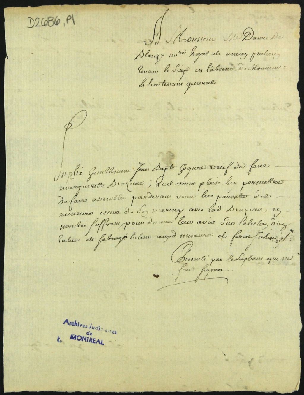 Tutelle des enfants mineurs de feu Marguerite Brazeau et de Jean Baptiste Hogue, 20 janvier 1758, Archives nationales à Montréal, Fonds Cour supérieure. District judiciaire de Montréal. Tutelles et curatelles, (06M,CC601,S1,SS1,D2686).