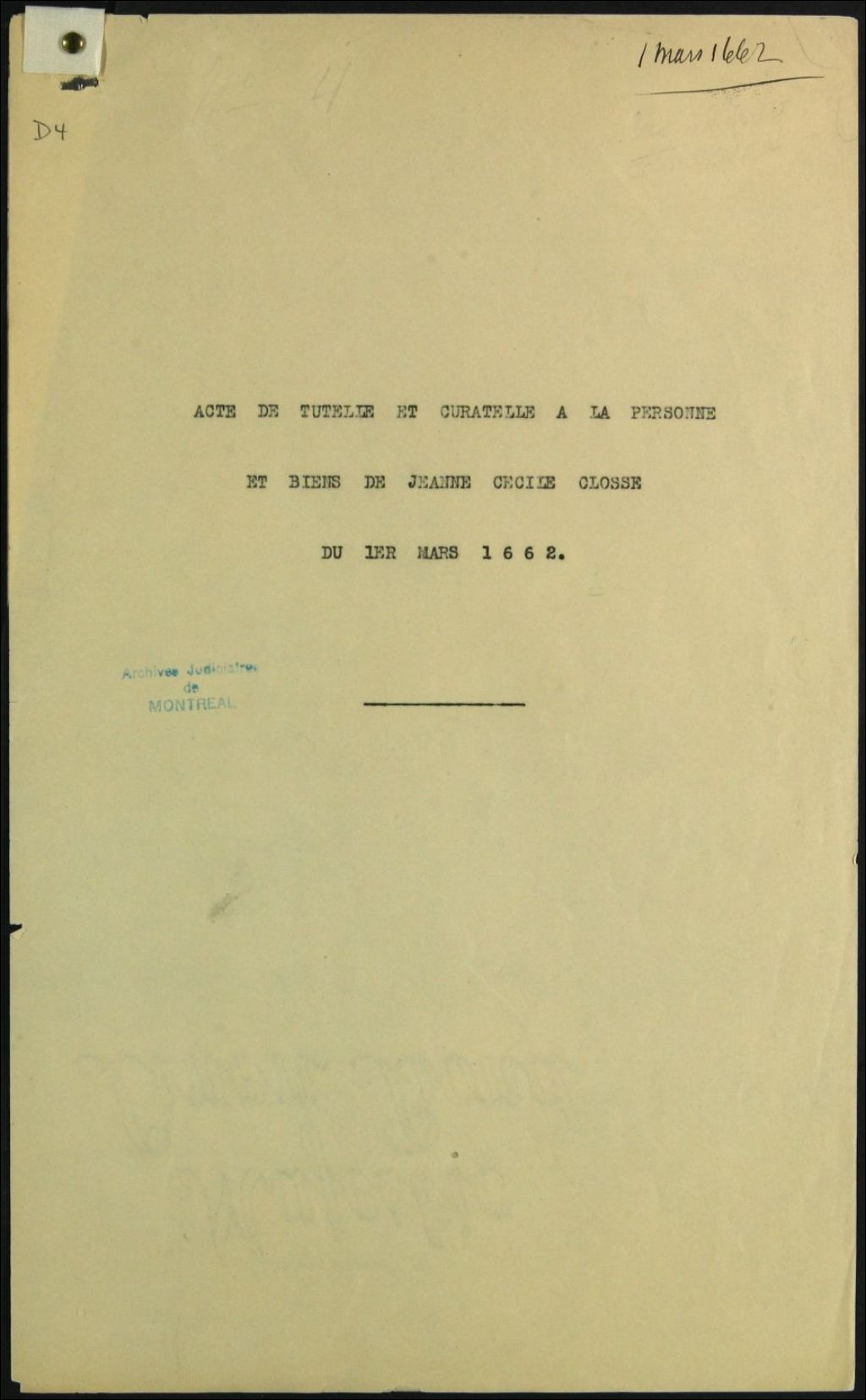 Tutelle et curatelle de l'enfant mineur de feu Lambert Closse [Lambert Raphaël Closse] et d'Élisabeth Moien [Élisabeth Isabelle Moyen], 1 mars 1662 (original), Archives nationales à Montréal, Fonds Cour supérieure. District judiciaire de Montréal. Tutelles et curatelles, (06M,CC601,S1,SS1,D4).
