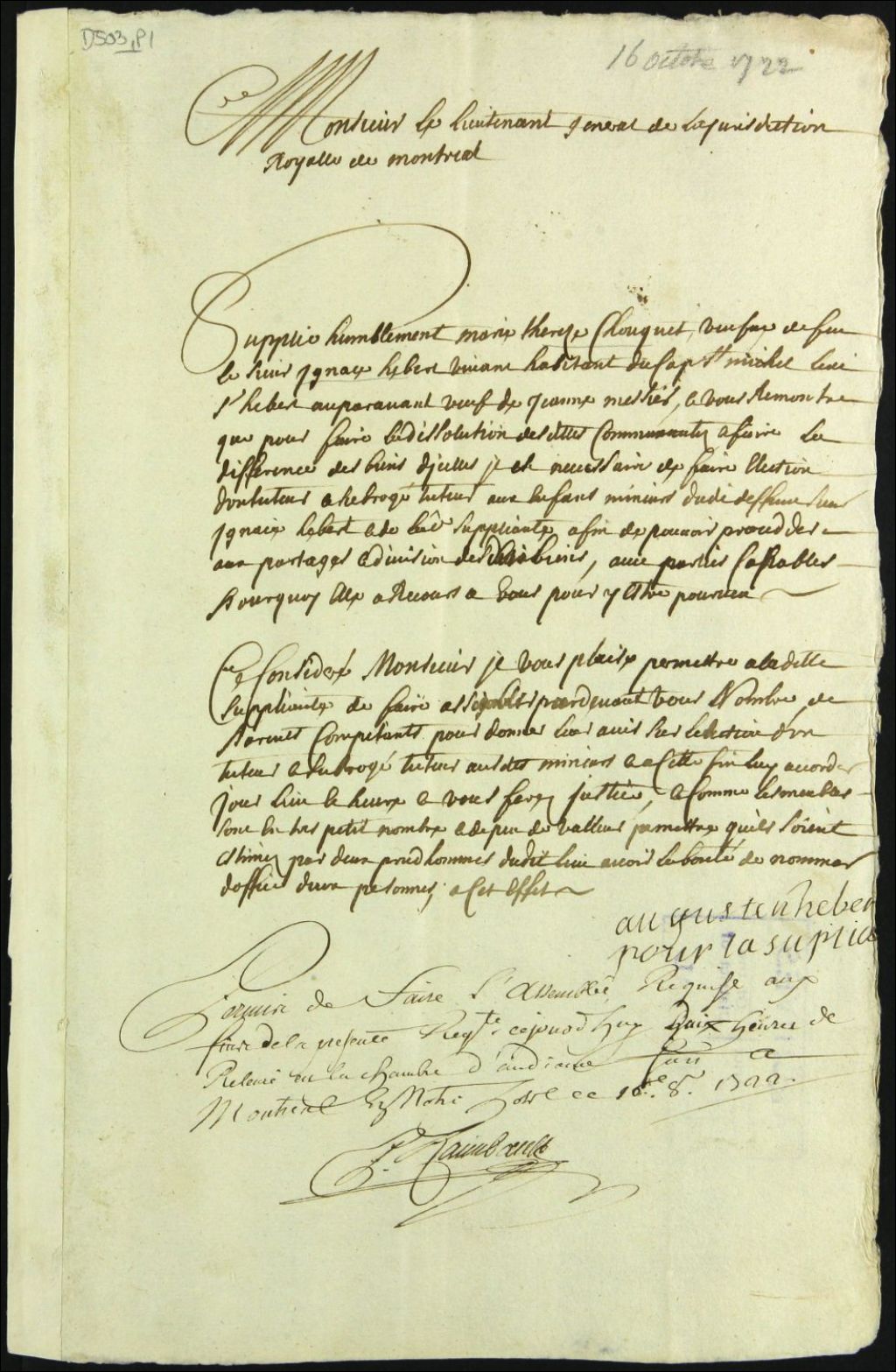 Tutelle des enfants mineurs de feu Ignace Hébert et de Marie Thérèse Choquet, 16 octobre 1722, Archives nationales à Montréal, Fonds Cour supérieure. District judiciaire de Montréal. Tutelles et curatelles, (06M,CC601,S1,SS1,D503).