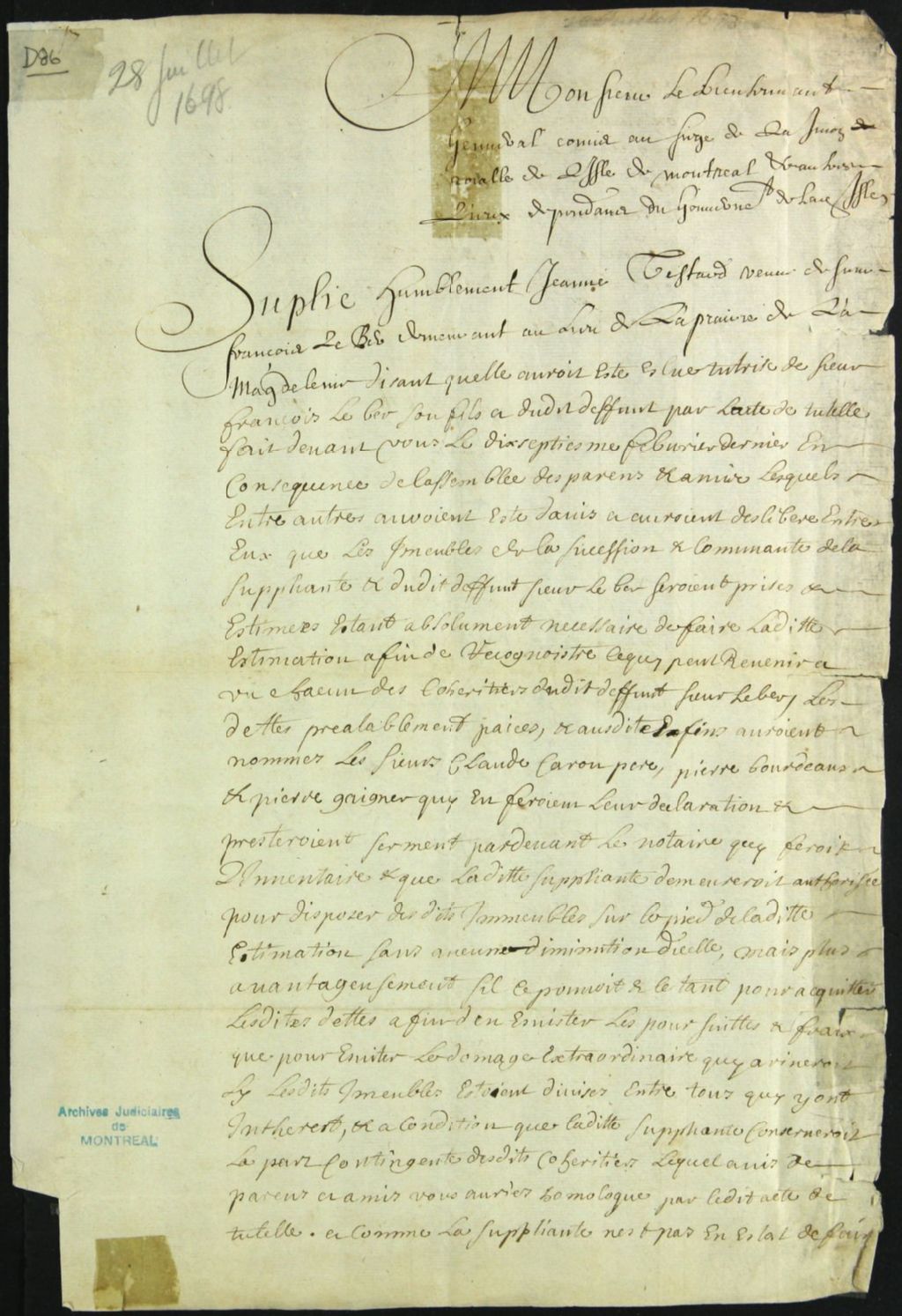 Tutelle de François LeBer, enfant mineur de feu François LeBer et de Jeanne Tétard - Administration tutélaire, 28 juillet 1698, Archives nationales à Montréal, Fonds Cour supérieure. District judiciaire de Montréal. Tutelles et curatelles, (06M,CC601,S1,SS1,D86).