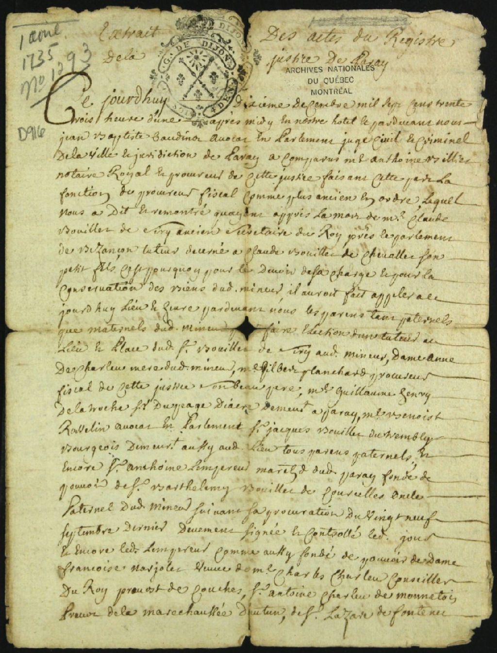 Extrait de la tutelle et de la curatelle de Claude Bouillet Chevalet, enfant mineur de feu Claude Bouillet Chevalet et d'Anne Charland, 1 avril 1735, Archives nationales à Montréal, Fonds Cour supérieure. District judiciaire de Montréal. Tutelles et curatelles, (06M,CC601,S1,SS1,D916).