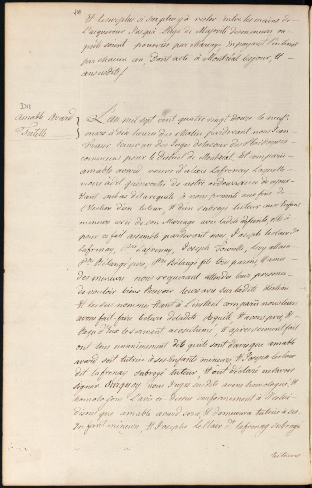 Tutelle des enfants mineurs de feu Alexis Lafrenaye et d' Amable Avard [Amable Avare], 9 mars 1792, Archives nationales à Montréal, Fonds Cour supérieure. District judiciaire de Montréal. Tutelles et curatelles, (06M,CC601,S1,SS2,D11).