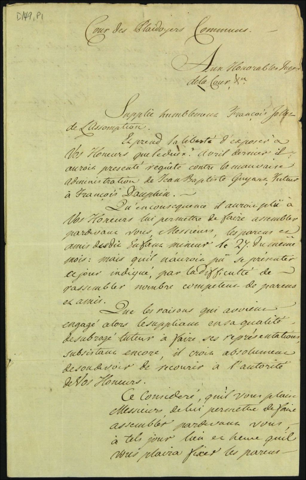 Tutelle de François Dauphin, fils mineur de feu Pierre Dauphin et de Thérèse Sévigny, 1 septembre 1792, Archives nationales à Montréal, Fonds Cour supérieure. District judiciaire de Montréal. Tutelles et curatelles, (06M,CC601,S1,SS2,D149).