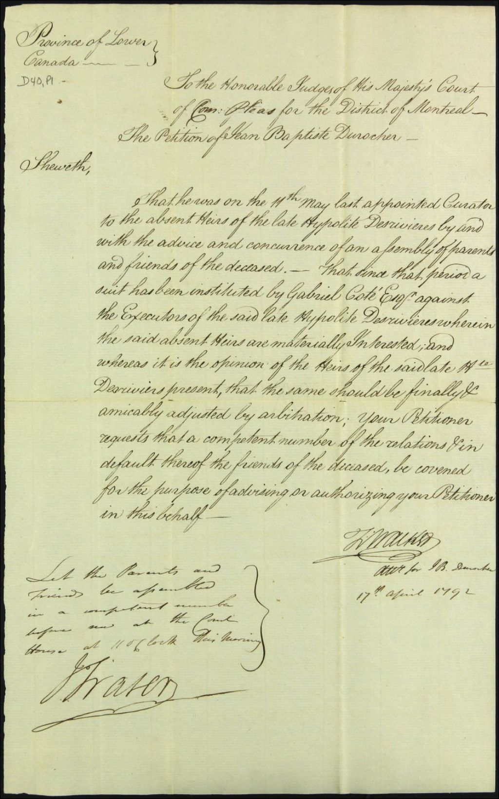 Curatelle des héritiers absents de la succesion de feu Hippolyte Desrivières, 18 avril 1792, Archives nationales à Montréal, Fonds Cour supérieure. District judiciaire de Montréal. Tutelles et curatelles, (06M,CC601,S1,SS2,D40).