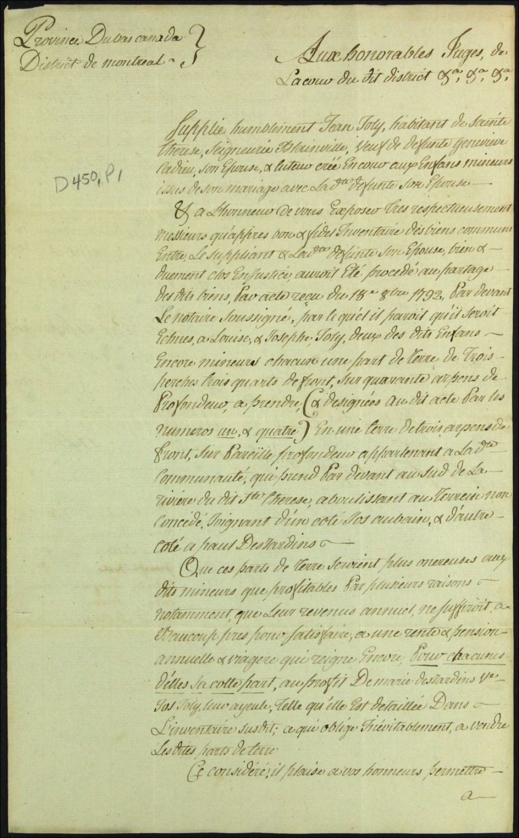 Tutelle des enfants mineurs de feu Geneviève Cadieu [Geneviève Cadieux] et de Jean Jolly [Jean Joly] - Administration tutélaire, 29 octobre 1793, Archives nationales à Montréal, Fonds Cour supérieure. District judiciaire de Montréal. Tutelles et curatelles, (06M,CC601,S1,SS2,D450).