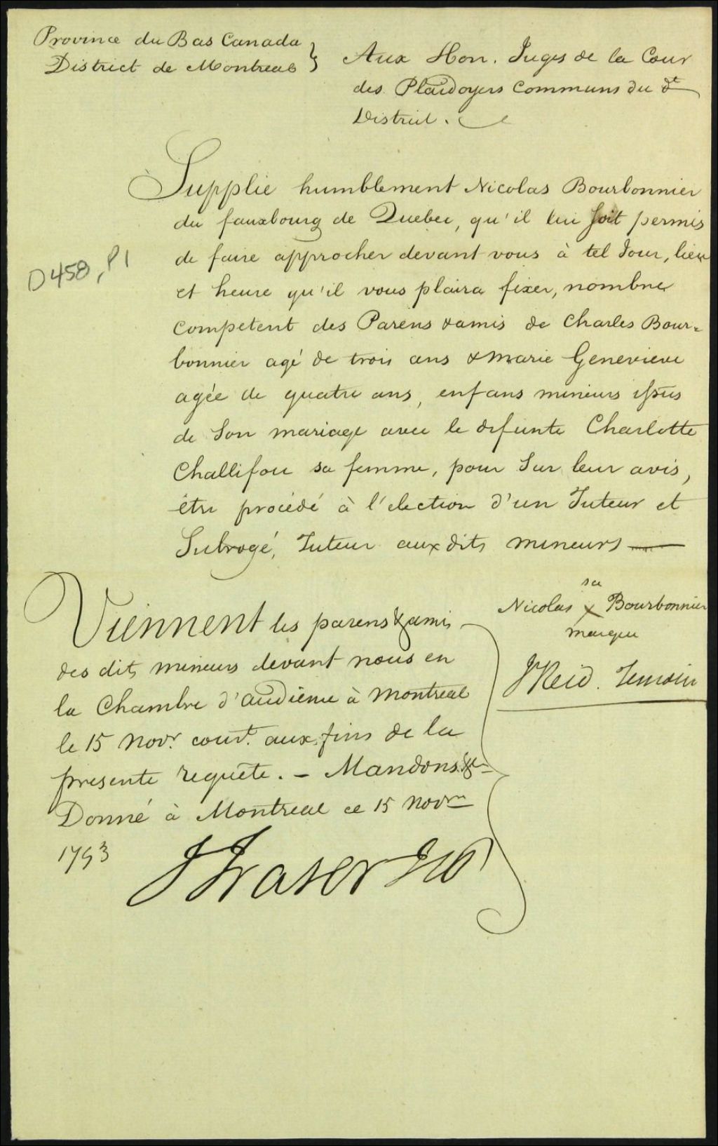 Tutelle des enfants mineurs de feu Charlotte Chalifou [Charlotte Chalifour] et de Charles Bourbonnière, 15 novembre 1793, Archives nationales à Montréal, Fonds Cour supérieure. District judiciaire de Montréal. Tutelles et curatelles, (06M,CC601,S1,SS2,D458).