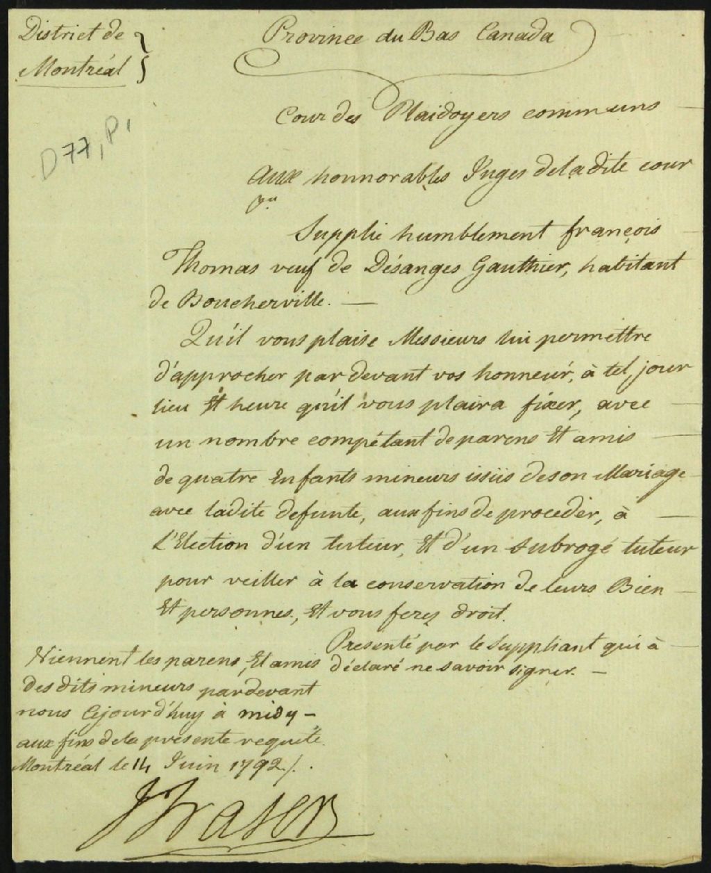 Tutelle des enfants mineurs de feu Desanges Gauthier et de François Thomas, 14 juin 1792, Archives nationales à Montréal, Fonds Cour supérieure. District judiciaire de Montréal. Tutelles et curatelles, (06M,CC601,S1,SS2,D77).