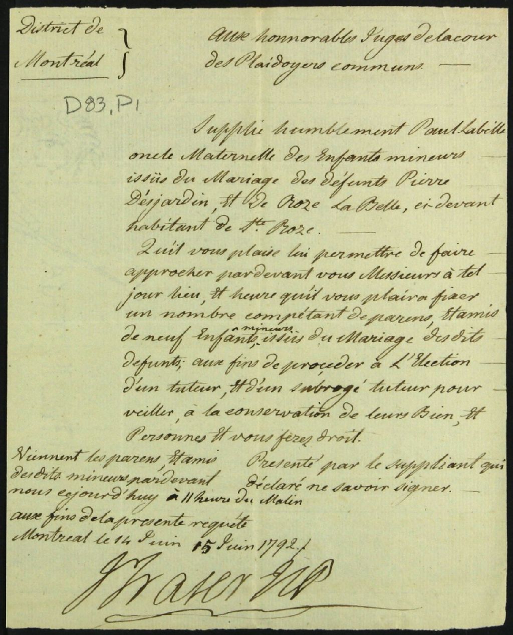 Tutelle des enfants mineurs des défunts Pierre Desjardins et Rose Labelle, 15 juin 1792, Archives nationales à Montréal, Fonds Cour supérieure. District judiciaire de Montréal. Tutelles et curatelles, (06M,CC601,S1,SS2,D83).