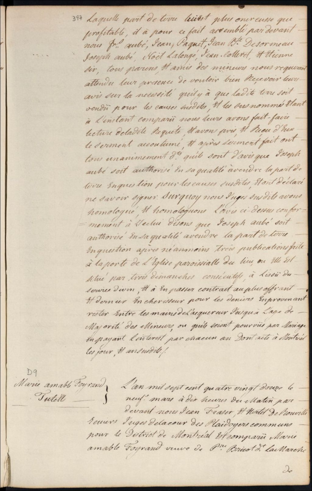 Tutelle des enfants mineurs de feu Pierre Bricault Lamarche et de Marie Amable Foisan, 9 mars 1792, Archives nationales à Montréal, Fonds Cour supérieure. District judiciaire de Montréal. Tutelles et curatelles, (06M,CC601,S1,SS2,D9).