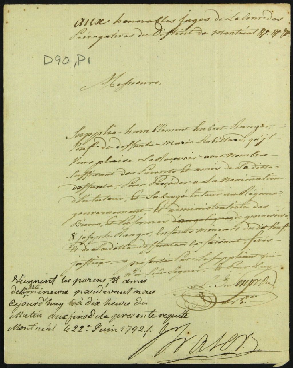 Tutelle des enfants mineurs de feu Marie Robillard et de Hubert Ranger, 22 juin 1792, Archives nationales à Montréal, Fonds Cour supérieure. District judiciaire de Montréal. Tutelles et curatelles, (06M,CC601,S1,SS2,D90).