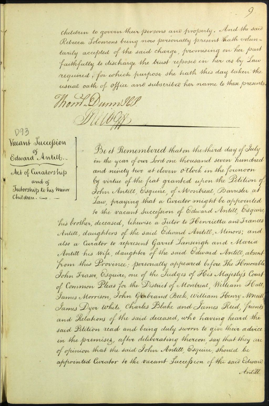 Curatelle de la succession de la succession vacante de feu Edward Antill, 3 juillet 1792, Archives nationales à Montréal, Fonds Cour supérieure. District judiciaire de Montréal. Tutelles et curatelles, (06M,CC601,S1,SS2,D93).