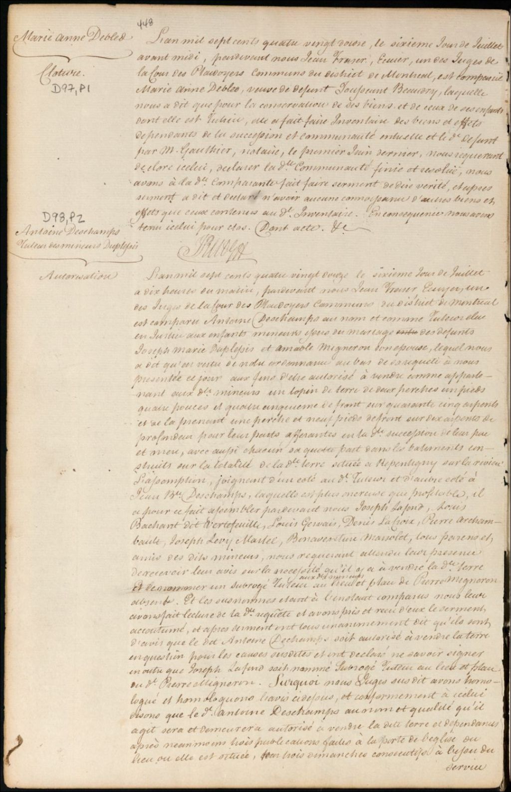 Tutelle des enfants mineurs de feu Toussaint Beaudry et de Marie Anne Debled - Administration tutélaire, 6 juillet 1792, Archives nationales à Montréal, Fonds Cour supérieure. District judiciaire de Montréal. Tutelles et curatelles, (06M,CC601,S1,SS2,D97).