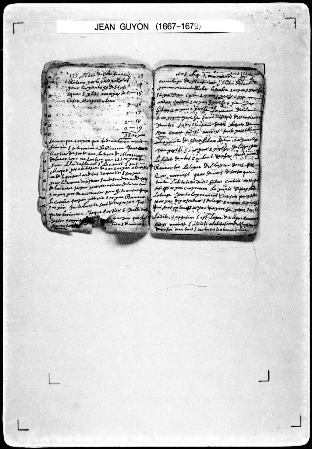 Procès-verbal d'arpentage de terres situées au village du feu sieur Madri (Madry), à la première concession de l'[arrière-fief de Montplaisir ou Mistanguienne ou Grandpré-de-la-Redoute] dans la [seigneurie de Notre-Dame-des-Anges]. La présente pièce concerne directement: Robert Lefeubre (Lefebvre); David Corbin; André Coudre (Coudret, Coudray); Jean Gibau (Gibault); la veuve Delile (Delisle) (arpenteur Jean Guyon), 4 novembre 1673, Archives nationales à Québec, Fonds Cour supérieure. District judiciaire de Québec. Greffes d'arpenteurs, (03Q,CA301,S21,P5).