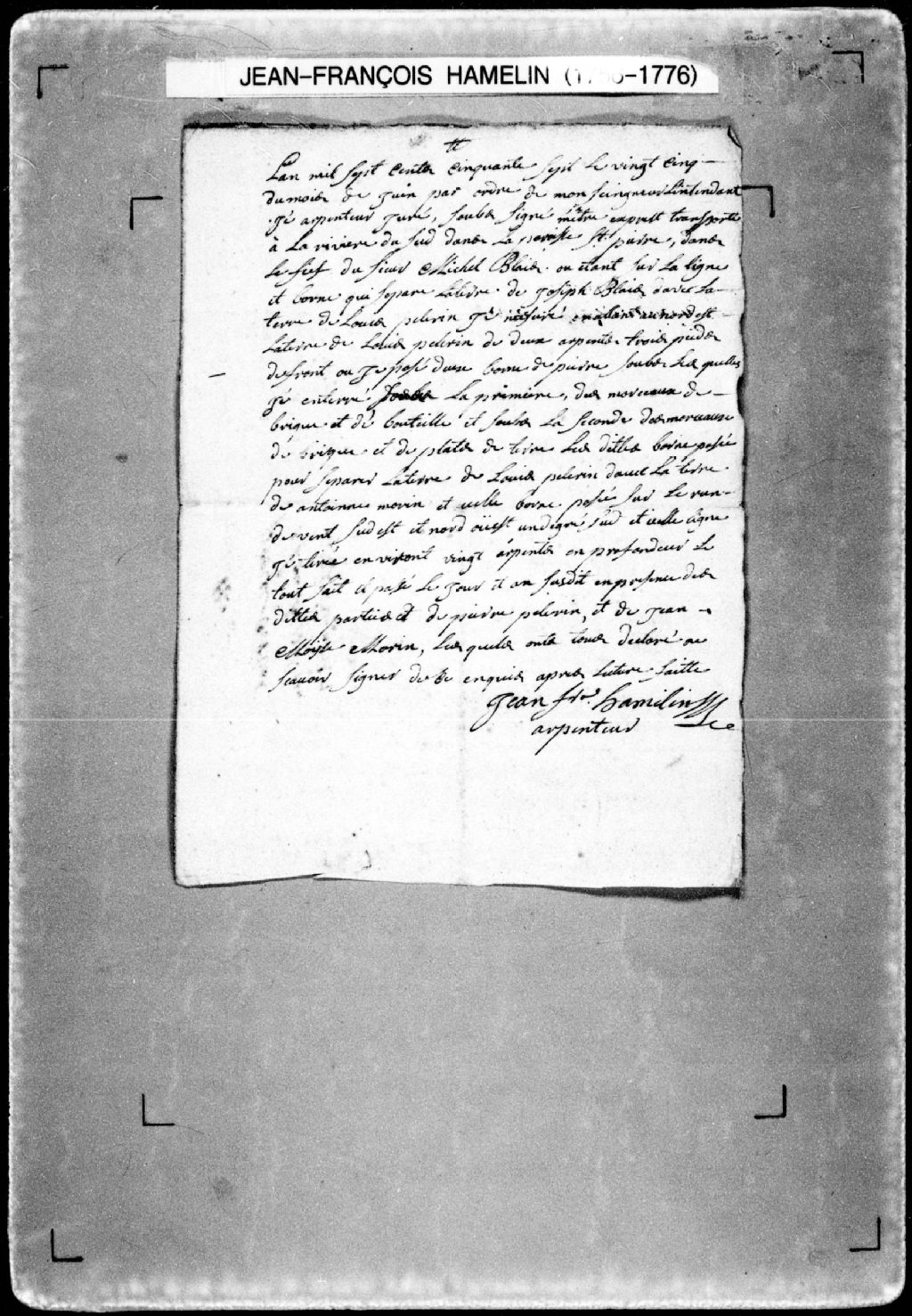 Procès-verbal de ligne et bornes séparant deux terres à la suite d'un ordre de l'intendant, lesquelles terres étant situées dans le fief du sieur Michel Blais, paroisse Saint-Pierre, [seigneurie de la Rivière-du-Sud]. La présente pièce concerne directement: Louis Pelerin (Pellerin); Antoine Morin (arpenteur Jean-François Hamelin), 25 juin 1757, Archives nationales à Québec, Fonds Cour supérieure. District judiciaire de Québec. Greffes d'arpenteurs, (03Q,CA301,S23,P30).