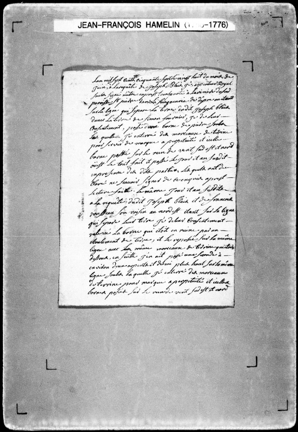 Procès-verbal de bornes séparant trois terres situées dans la paroisse Saint-Pierre, dans l'[arrière-fief] Després de la seigneurie de la Rivière-du-Sud. La présente pièce concerne directement: Joseph Blais; Simon Fournier; François Rousseau (arpenteur Jean-François Hamelin), 28 juin 1757, Archives nationales à Québec, Fonds Cour supérieure. District judiciaire de Québec. Greffes d'arpenteurs, (03Q,CA301,S23,P32).