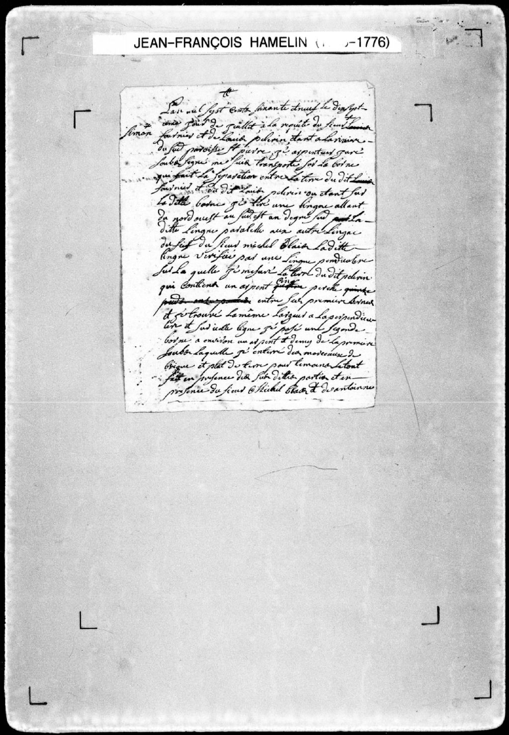 Procès-verbal de ligne et bornes séparant deux terres parallèles aux autres lignes du fief du sieur Michel Blais, situées dans la paroisse Saint-Pierre, [seigneurie de la Rivière-du-Sud]. La présente pièce concerne directement: Simon Fournier; Louis Pelerin (Pellerin) (arpenteur Jean-François Hamelin), 17 juillet 1769, Archives nationales à Québec, Fonds Cour supérieure. District judiciaire de Québec. Greffes d'arpenteurs, (03Q,CA301,S23,P74).