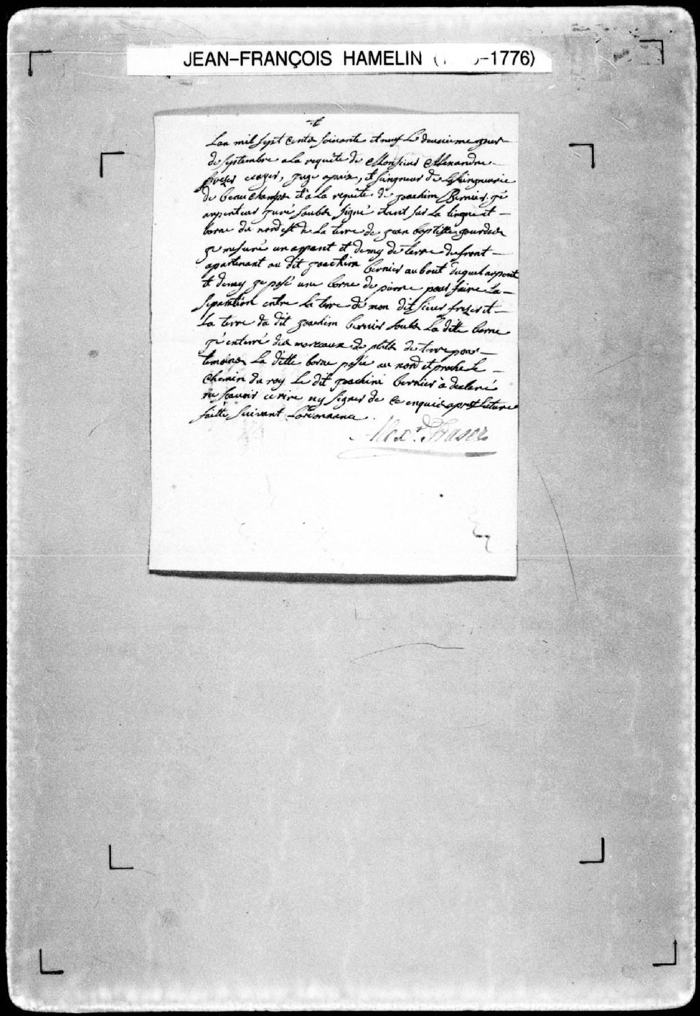 Procès-verbal de borne séparant deux terres situées près du chemin du Roi dans la seigneurie de Beauchamp (seigneurie de La Martinière). La présente pièce concerne directement: Alexandre Frezer (Fraser), écuyer, juge de paix, seigneur de la seigneurie de Beauchamp; Joachim Bernier (arpenteur Jean-François Hamelin), 2 septembre 1769, Archives nationales à Québec, Fonds Cour supérieure. District judiciaire de Québec. Greffes d'arpenteurs, (03Q,CA301,S23,P77).