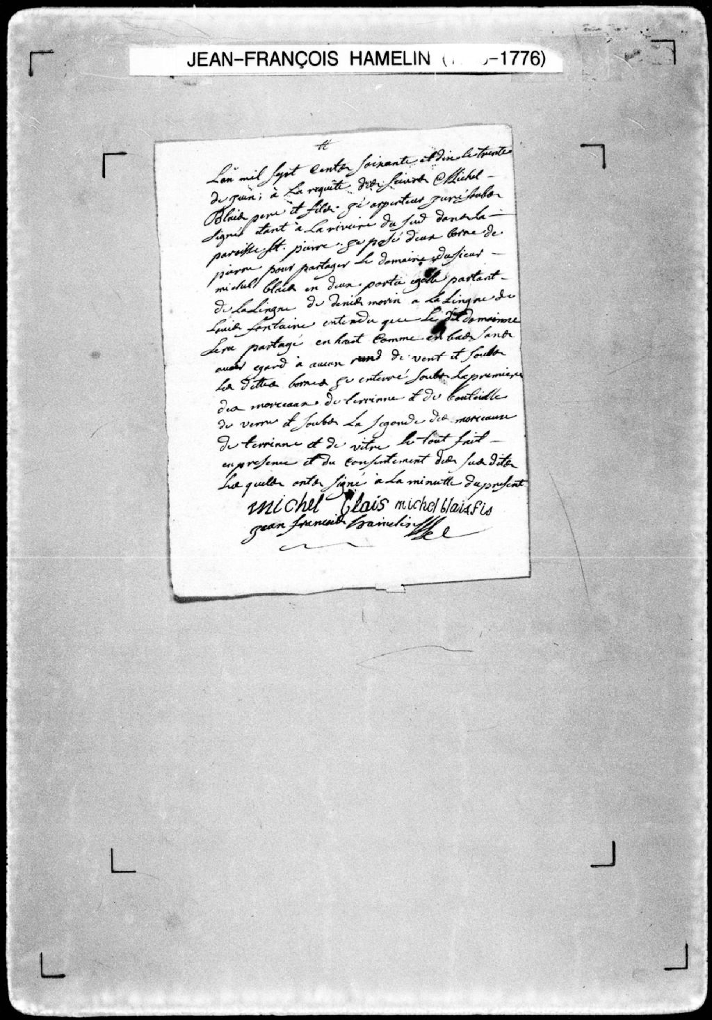 Procès-verbal de partage d'un domaine et de chaînage et bornes des portions, lequel domaine étant situé dans la paroisse Saint-Pierre, seigneurie de la Rivière-du-Sud. La présente pièce concerne directement: Michel Blais (père) (arpenteur Jean-François Hamelin), 30 juin 1770, Archives nationales à Québec, Fonds Cour supérieure. District judiciaire de Québec. Greffes d'arpenteurs, (03Q,CA301,S23,P83).
