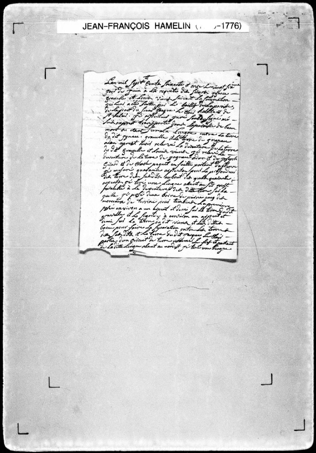 Procès-verbal de chaînage, lignes et bornes de la profondeur de cinq terres et de leur séparation d'avec un aboutissant, lesquelles terres étant situées sur le fleuve Saint-Laurent et attenant à un circuit de terre nommé le fief, dans la paroisse de Beaumont, seigneurie de Beaumont. La présente pièce concerne directement: Ignace Gravelle (Gravel); Louis Viens (Vien); Ignace Adan (Adam); Joseph Girard; Charles Paquet; Jacques LeClair (Leclerc) (arpenteur Jean-François Hamelin)