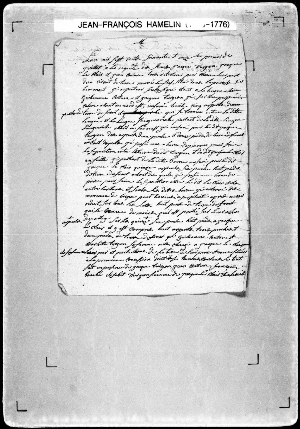 Procès-verbal de chaînage, lignes et bornes de deux terres faisant partie d'un circuit de terre nommé le fief et situées jusqu'à la ligne seigneuriale dans la paroisse de Beaumont, seigneurie de Beaumont. La présente pièce concerne directement: Jacques Turgeon; Jacques LeClair (Leclerc) (arpenteur Jean-François Hamelin), 1er juillet 1771, Archives nationales à Québec, Fonds Cour supérieure. District judiciaire de Québec. Greffes d'arpenteurs, (03Q,CA301,S23,P94).