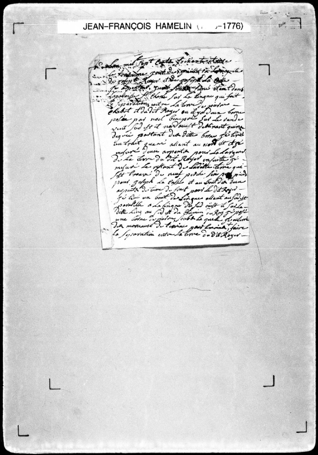 Procès-verbal de ligne et bornes séparant deux terres situées au sud du chemin du Roi, dans la paroisse Saint-Charles. La présente pièce concerne directement: Joseph Royer; Joseph LaCasse (arpenteur Jean-François Hamelin), 3 juillet 1771, Archives nationales à Québec, Fonds Cour supérieure. District judiciaire de Québec. Greffes d'arpenteurs, (03Q,CA301,S23,P95).