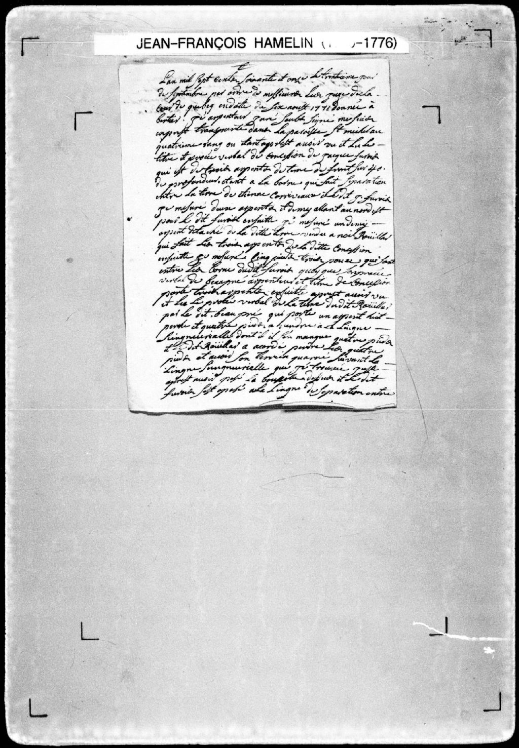 Procès-verbal de ligne séparant deux terres situées au quatrième rang, dans la paroisse de Saint-Michel. La présente pièce concerne directement: Jacques Furois (Surois); Noël Rouillard (arpenteur Jean-François Hamelin), 30 septembre 1771, Archives nationales à Québec, Fonds Cour supérieure. District judiciaire de Québec. Greffes d'arpenteurs, (03Q,CA301,S23,P98).