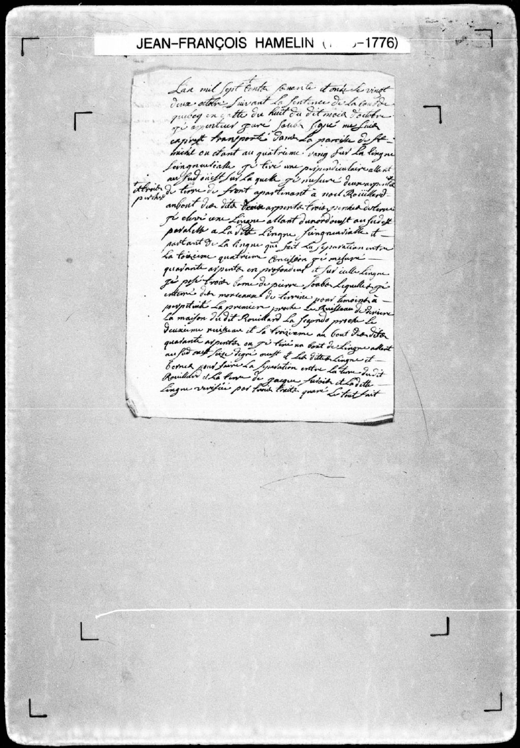 Procès-verbal de ligne et bornes séparant deux terres situées sur la ligne seigneuriale, au quatrième rang, dans la paroisse de Saint-Michel. La présente pièce concerne directement: Jacques Furois (Surois); Noël Rouillard (arpenteur Jean-François Hamelin), 22 octobre 1771, Archives nationales à Québec, Fonds Cour supérieure. District judiciaire de Québec. Greffes d'arpenteurs, (03Q,CA301,S23,P99).