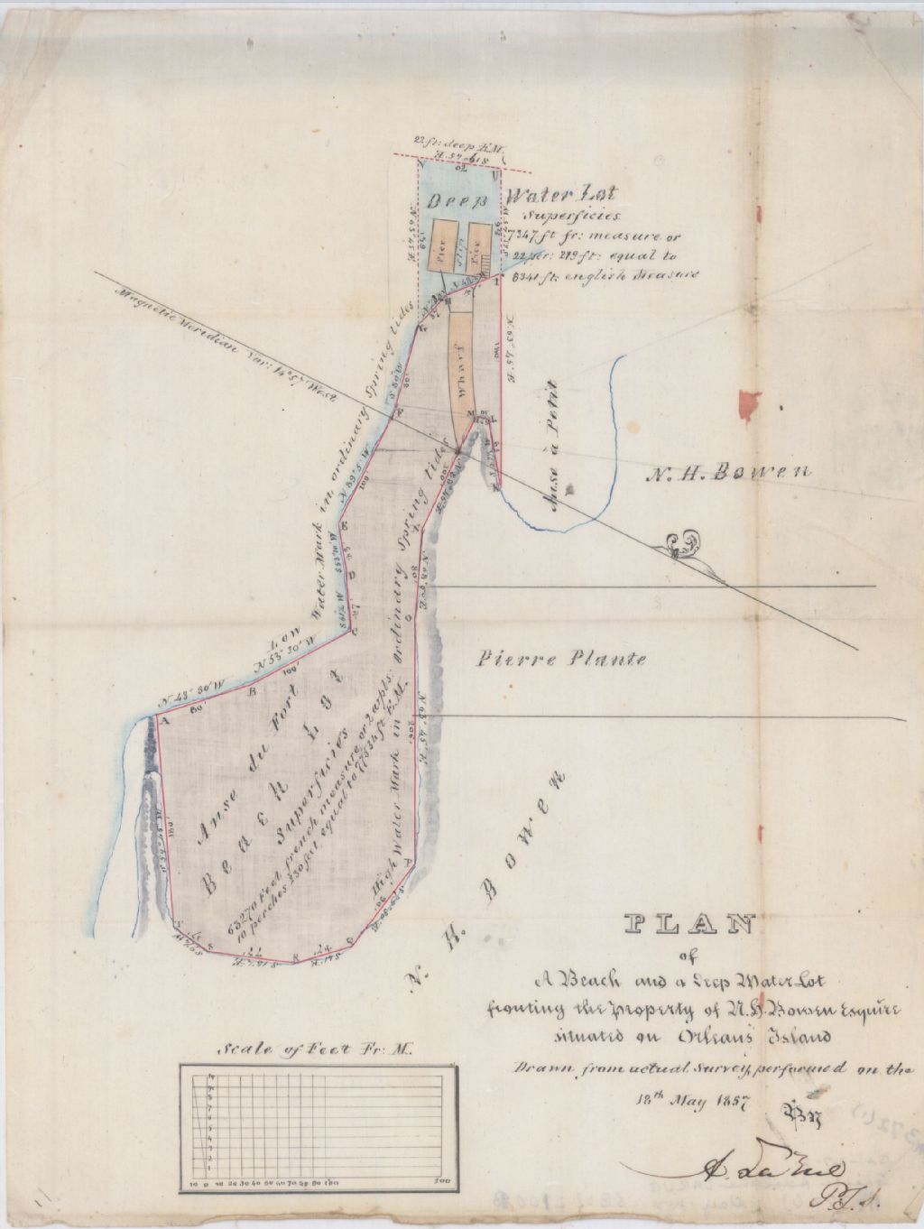 Plan of a beach and deep water lots fronting the property of N.H. Bowen situated on Orleans Island.