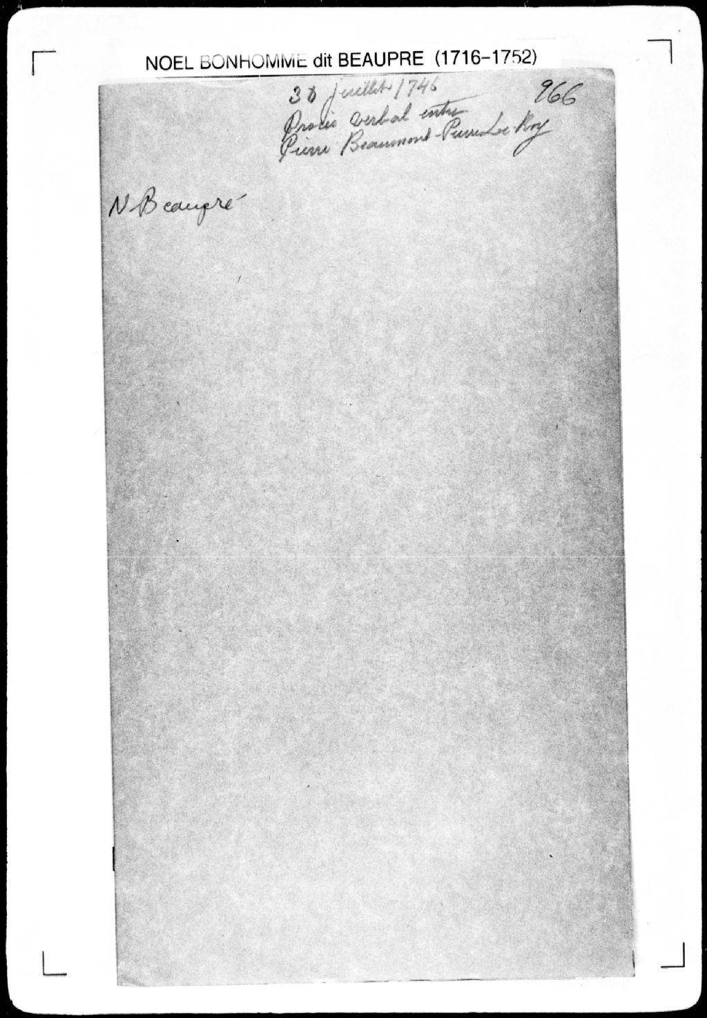 Procès-verbal de ligne et bornes séparant deux terres situées à l'endroit appelé Ville-Marie, seigneurie de Beaumont. La présente pièce concerne directement: Pierre Beaumont; Pierre Le Roy (Leroy, Roy) (arpenteur Noël Bonhomme dit Beaupré), 30 juillet 1746, Archives nationales à Québec, Fonds Cour supérieure. District judiciaire de Québec. Greffes d'arpenteurs, (03Q,CA301,S2,P1019).