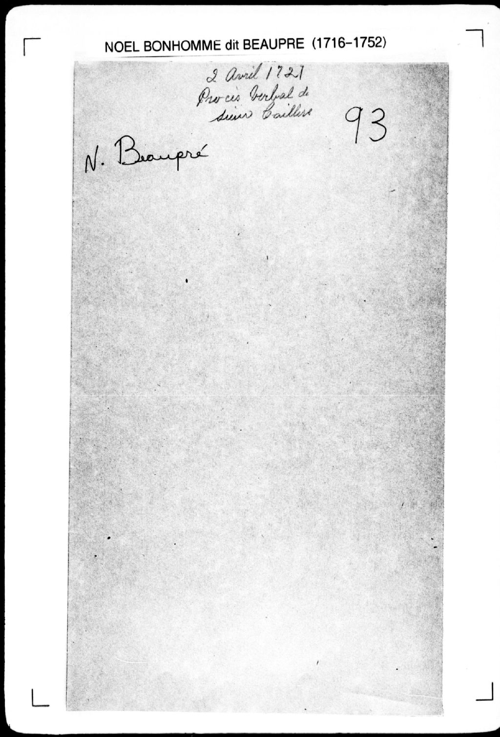 Procès-verbal de chaînage, lignes et bornes de quatre terres situées dans la seigneurie de Gentilly. La présente pièce concerne directement: le sieur Cailla; le sieur Bagueville (Bacqueville); le sieur Lecuyez (Lécuyer); le domaine de la seigneurie (arpenteur Noël Bonhomme dit Beaupré), 2 avril 1721, Archives nationales à Québec, Fonds Cour supérieure. District judiciaire de Québec. Greffes d'arpenteurs, (03Q,CA301,S2,P105).